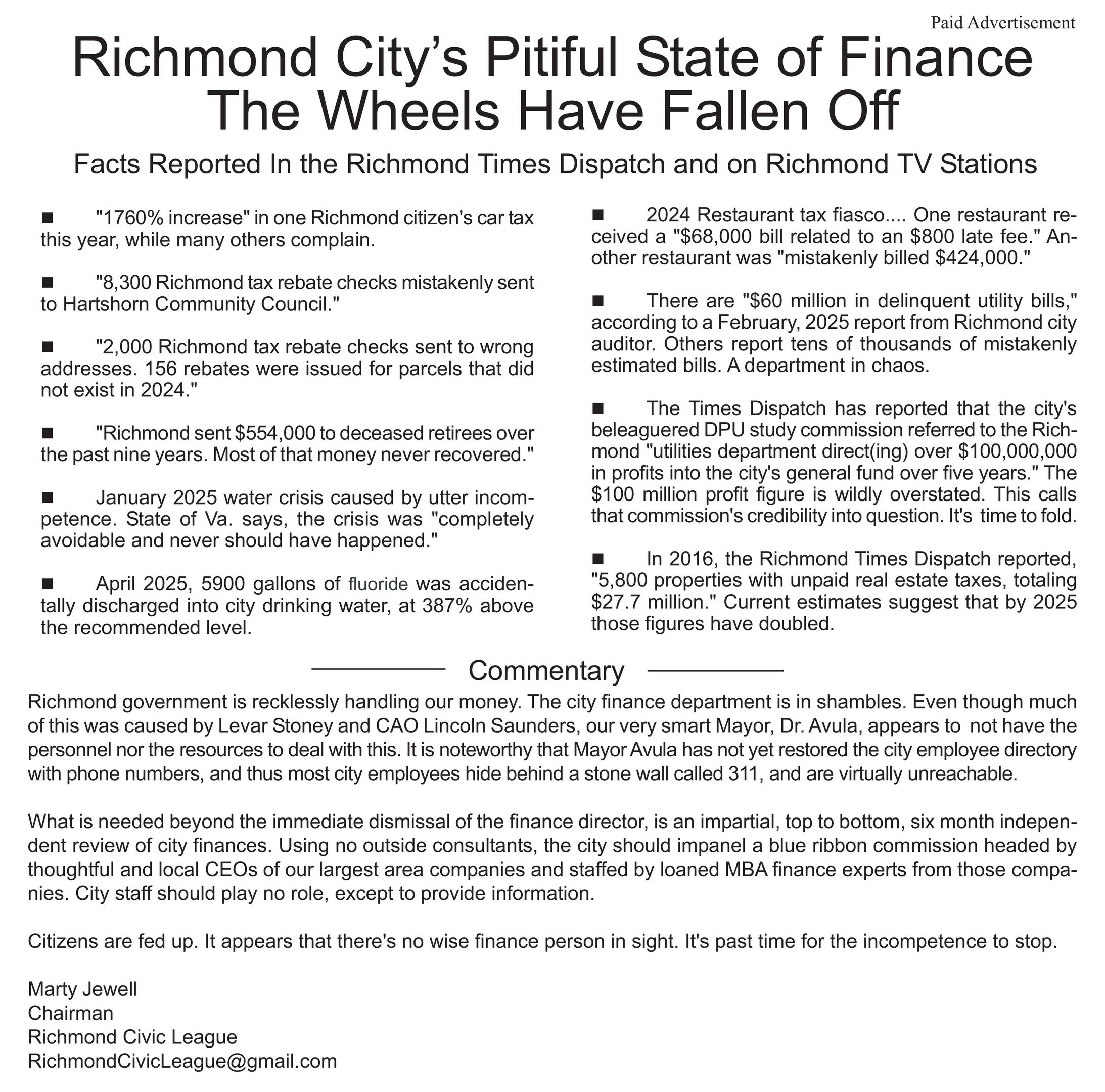 We are deeply concerned with the current deteriorated state of Richmond’s government operations, left almost in ashes by Levar Stoney and Lincoln Saunders. Our recent half page article on page 3 of the Richmond Times Dispatch was entitled, “The Pitiful State of Richmond City Finance. The Wheels have fallen off.” We are serious.